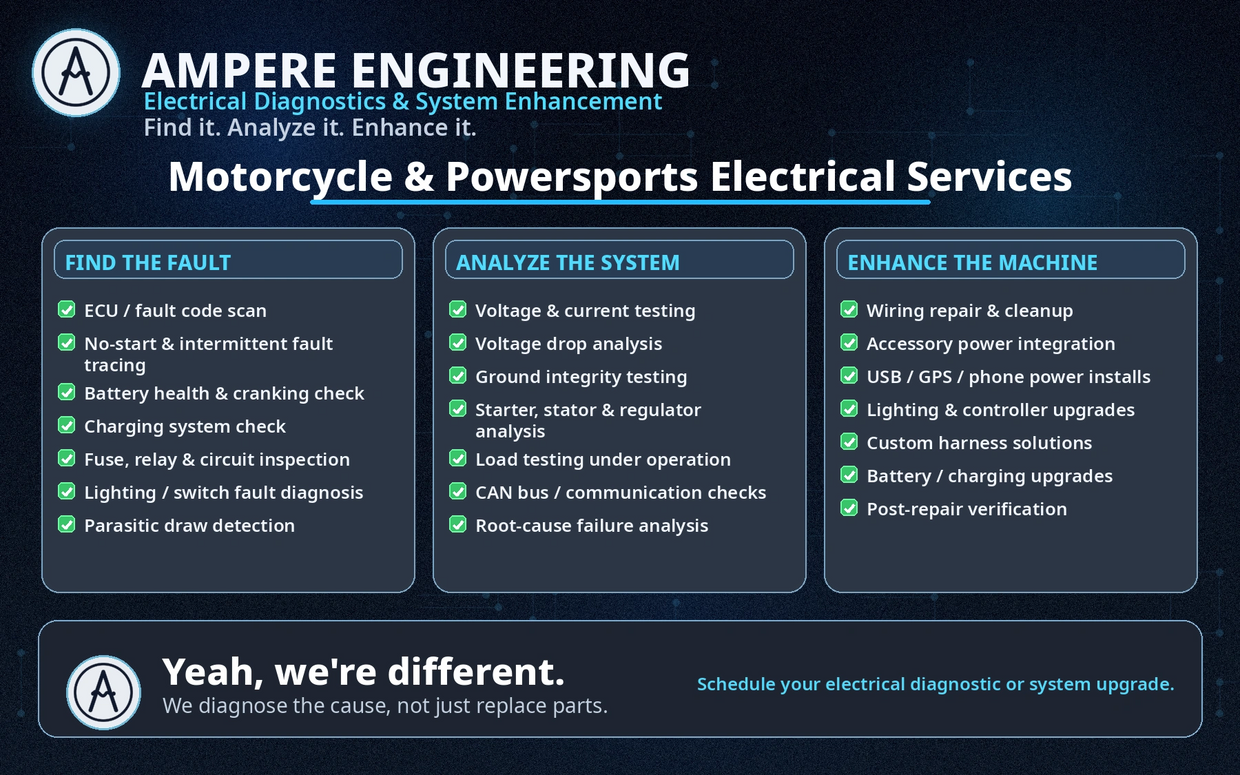 Use the form below to schedule your free diagnostic session with Ampere Engineering. We service motorcycles, ATVs, UTVs, SxS, and custom builds.